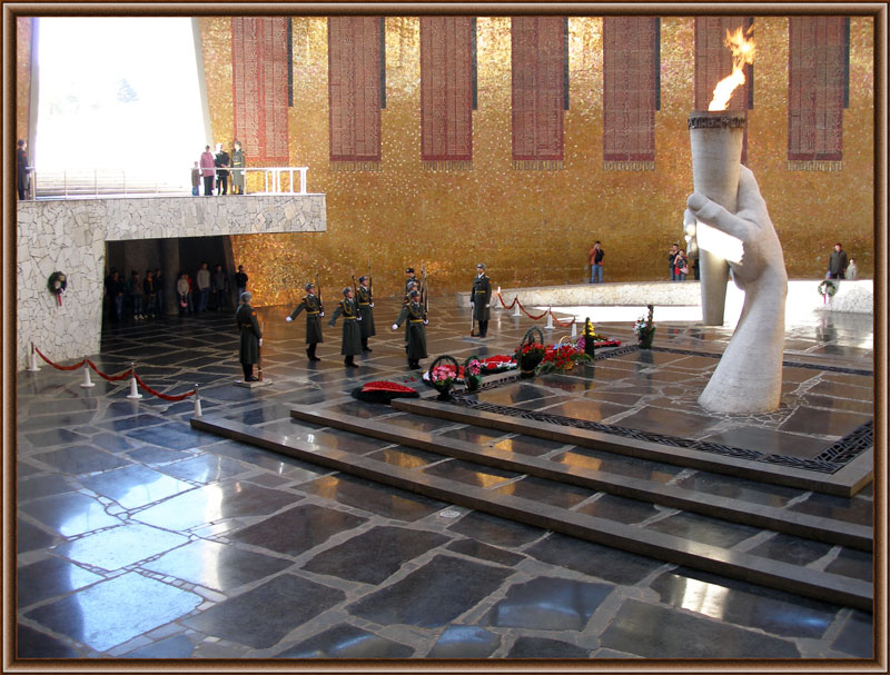 Внизу вход в пантеон, и по кругу поднимаешься к выходу, к скорбящей матери (фото есть). Внутри пантеона постоянно звучит траурная мелодия, а на стене мозаичные знамена с фамилиями погибших.