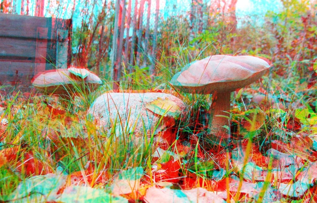2. потеря цвета - я не расчитывал, что в кадре так много красного (который теряется при технологии анаглифов) спрятано. И шляпка грибов из приятного коричневого превратилась в глинистый цвет, много березовых листиков стали просто осиновыми серыми.