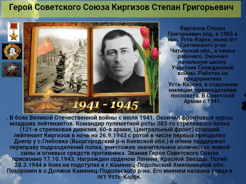 | Киргизов Степан Григорьевич род. в 1903 в пос. Усть-Карск, ныне пгт Сретенского р-на Читинской обл., в семье рабочего. Окончил начальную школу. Участник Гражданской войны. Работал на предприятиях Усть-Карска, в отделении милиции, председателем поссовета. В Советской Армии с 1941. В боях Великой Отечественной войны с июля 1941. Окончил фронтовые курсы младших лейтенантов. Командир пулеметной роты 383-го стрелкового полка (121-я стрелковая дивизия, 60-я армия, Центральный фронт) старший лейтенант Киргизов в ночь на 26.9.1943 с ротой в числе первых преодолел Днепр у с.Глебовка (Вышгородский р-н Киевской обл.) и огнем поддержал переправу подразделений полка, уничтожив значительное количество живой силы и огневых средств противника. Звание Героя Советского Союза присвоено 17.10.1943. Награжден орденом Ленина, Красной Звезды. Погиб 28.3.1944 в боях на подступах к г.Каменец-Подольский Хмельницкой обл. Похоронен в с.Должок Каменец-Подольского р-на. Его именем названа улица в пгт Усть-Карск.